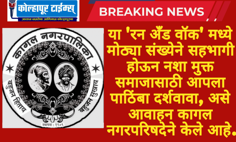 या ‘रन अँड वॉक’ मध्ये मोठ्या संख्येने सहभागी होऊन नशा मुक्त समाजासाठी आपला पाठिंबा दर्शवावा, असे आवाहन कागल नगरपरिषदेने केले आहे.