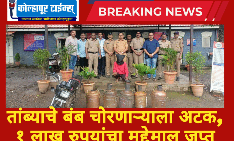 कोल्हापूर (सलीम शेख ) : कोल्हापूर जिल्ह्यातील करवीर पोलिसांनी तांब्याचे बंब चोरी करणाऱ्या एका चोरट्याला अटक करून त्याच्याकडून तब्बल १ लाख रुपयांचा मुद्देमाल जप्त केला आहे. या कारवाईत चोरीला गेलेले पाच तांब्याचे बंब आणि एक हिरो स्प्लेंडर प्लस मोटरसायकल हस्तगत करण्यात आली आहे.