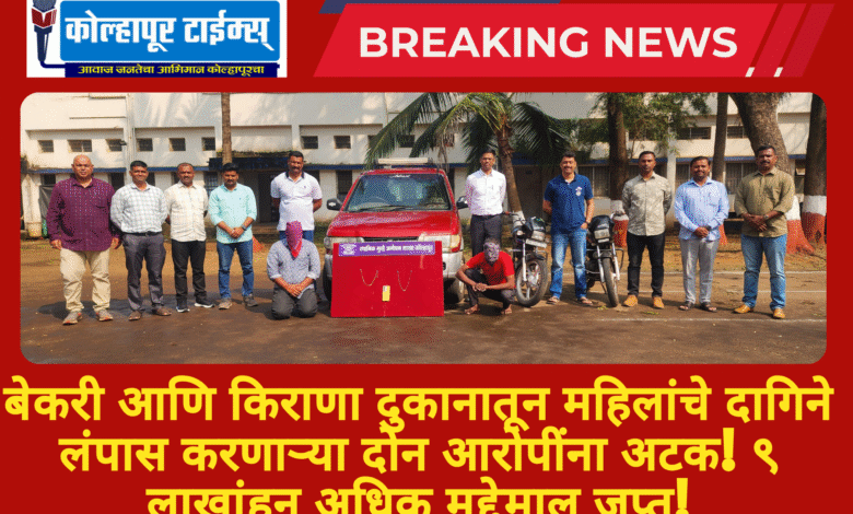 कोल्हापूर (सलीम शेख ) : कोल्हापूर जिल्ह्यातील स्थानिक गुन्हे अन्वेषण शाखेच्या पथकाने बेकरी व किराणा दुकानांमधील महिलांच्या गळ्यातील सोन्याचे दागिने जबरदस्तीने चोरणाऱ्या दोन सराईत चोरट्यांना अटक केली आहे. या आरोपींकडून तब्बल २२ ग्रॅम सोन्याचे दागिने, चोरीची स्प्लेंडर मोटारसायकल, तवेरा गाडी आणि अन्य साहित्य मिळून एकूण ९,१६,०५० रुपयांचा मुद्देमाल जप्त करण्यात आला आहे.