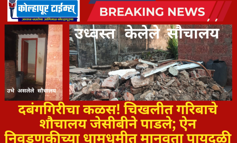 चिखली (प्रतिनिधी, बाळासो कांबळे): एकीकडे जिल्हा परिषद आणि पंचायत समितीच्या निवडणुकीचे बिगुल वाजले असून सर्वत्र विकासाच्या गप्पा मारल्या जात आहेत, तर दुसरीकडे कागल तालुक्यातील चिखली (दसरा चौक) येथे माणुसकीला काळिमा फासणारी एक धक्कादायक घटना समोर आली आहे. गेल्या १५ वर्षांपासून वास्तव्यास असलेल्या अमोल बाळासो लोहार या गरीब कुटुंबाचे हक्काचे शौचालय शेजारी राहणाऱ्या व्यक्तीने जेसीबीच्या साह्याने जमीनदोस्त केले आहे. या घटनेमुळे परिसरात तीव्र संताप व्यक्त होत आहे. अमोल लोहार हे अत्यंत गरीब असून मजुरी करून आपल्या कुटुंबाचा उदरनिर्वाह करतात. त्यांच्या घरात वयोवृद्ध आई, पत्नी आणि दोन लहान मुले असा परिवार आहे. मिळालेल्या माहितीनुसार, स्थानिक रहिवासी दादू हरी बेनाडे याने कोणतीही पूर्वसूचना न देता किंवा कोणताही कायदेशीर आधार नसताना हुकूमशाही पद्धतीने जेसीबी आणला. चालक तकदीर इस्माईल किल्लेदार याच्या मदतीने क्षणात हे शौचालय पाडून टाकले. ऐन थंडीच्या दिवसात आणि निवडणुकीच्या काळात हे कृत्य केल्याने लोहार कुटुंबासमोर मोठे संकट उभे राहिले आहे. “आता माझ्या वृद्ध आईने आणि घरातील महिलांनी उघड्यावर शौचास जायचे का?” असा उद्विग्न सवाल अमोल लोहार यांनी उपस्थित केला आहे.