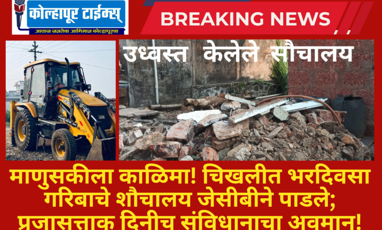 चिखली (ता. कागल) | प्रतिनिधी : बाळासो कांबळे: एकीकडे केंद्र आणि राज्य सरकार ‘स्वच्छ भारत अभियान’ यशस्वी करण्यासाठी कोट्यवधींचा निधी खर्च करत असताना, दुसरीकडे कोल्हापूर जिल्ह्यातील चिखली (ता. कागल) येथे एक धक्कादायक आणि माणुसकीला काळिमा फासणारी घटना घडली आहे. जिल्हा परिषद निवडणुकीची आचारसंहिता लागू असतानाही, कायद्याचा कोणताही धाक न बाळगता एका गरिबाच्या हक्काचे शौचालय जेसीबीच्या साहाय्याने जमीनदोस्त करण्यात आले आहे. याप्रकरणी मुरगूड पोलिसांनी संशयित आरोपीविरुद्ध गुन्हा दाखल केला असून परिसरात संतापाची लाट उसळली आहे.